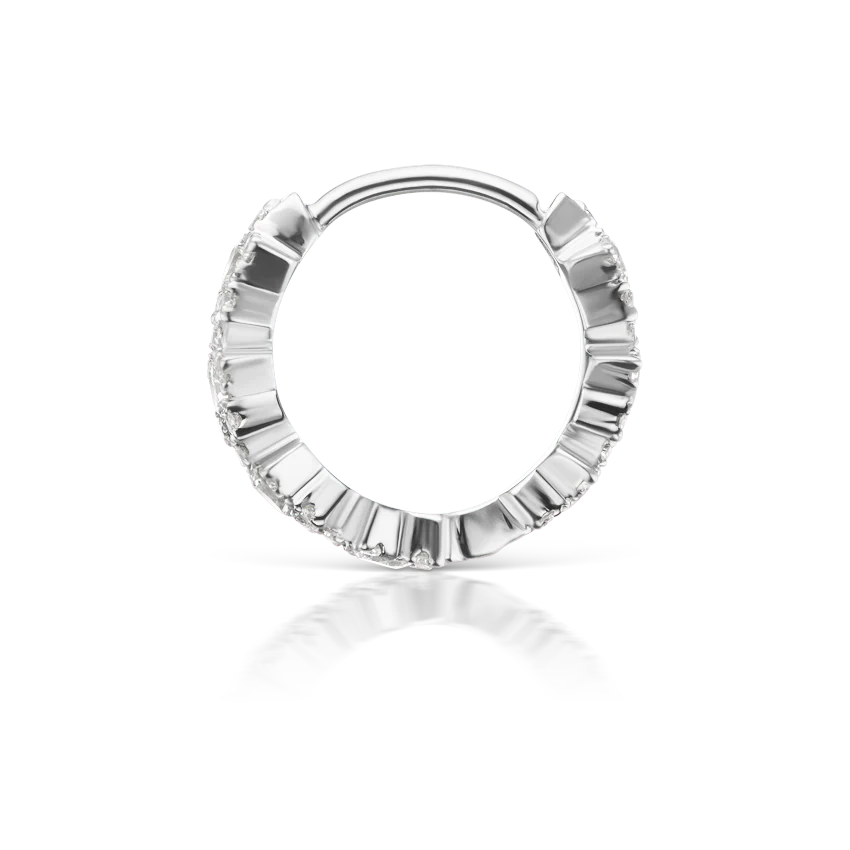 A row of brilliant diamond stars orbits a solid gold ring in this variation on our classic eternity. Each star features a center diamond framed by five smaller diamonds.