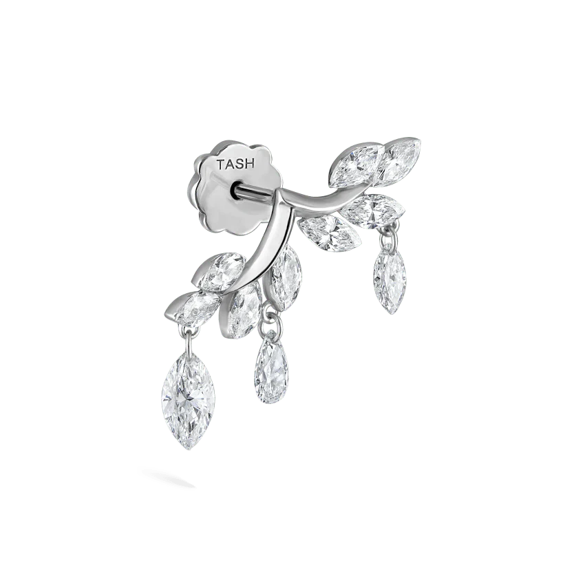 This elegant stud is inspired by a pair of vine earrings from Maria's personal collection. She added details like invisible set marquise diamonds and alternating floating marquise and pear diamonds for eye-catching movement. This piece is designed to climb the ear and is ideal for the Lobe, TASH Rook, and Helix.